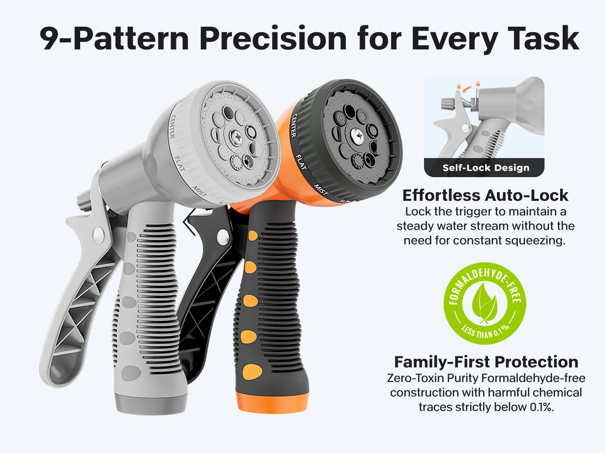 9-Spray Nozzle: Versatile patterns with a comfortable, non-slip grip.