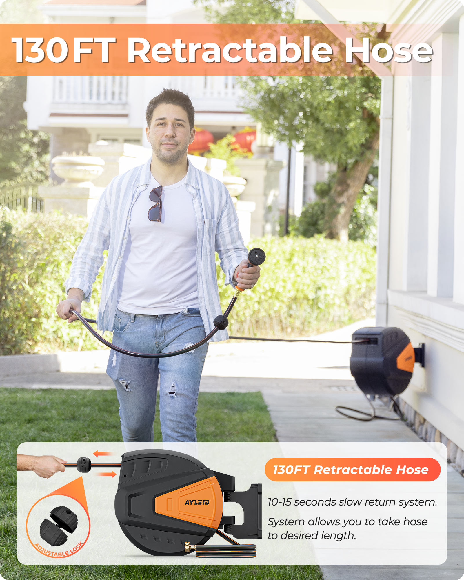 Ayleid Retractable Garden Hose Reel,1/2 in x 130 ft Wall Mounted Hose Reel, with 9- Function Sprayer Nozzle, Any Length Lock/Slow Return System/Wall Mounted/180°Swivel Bracket (Black)